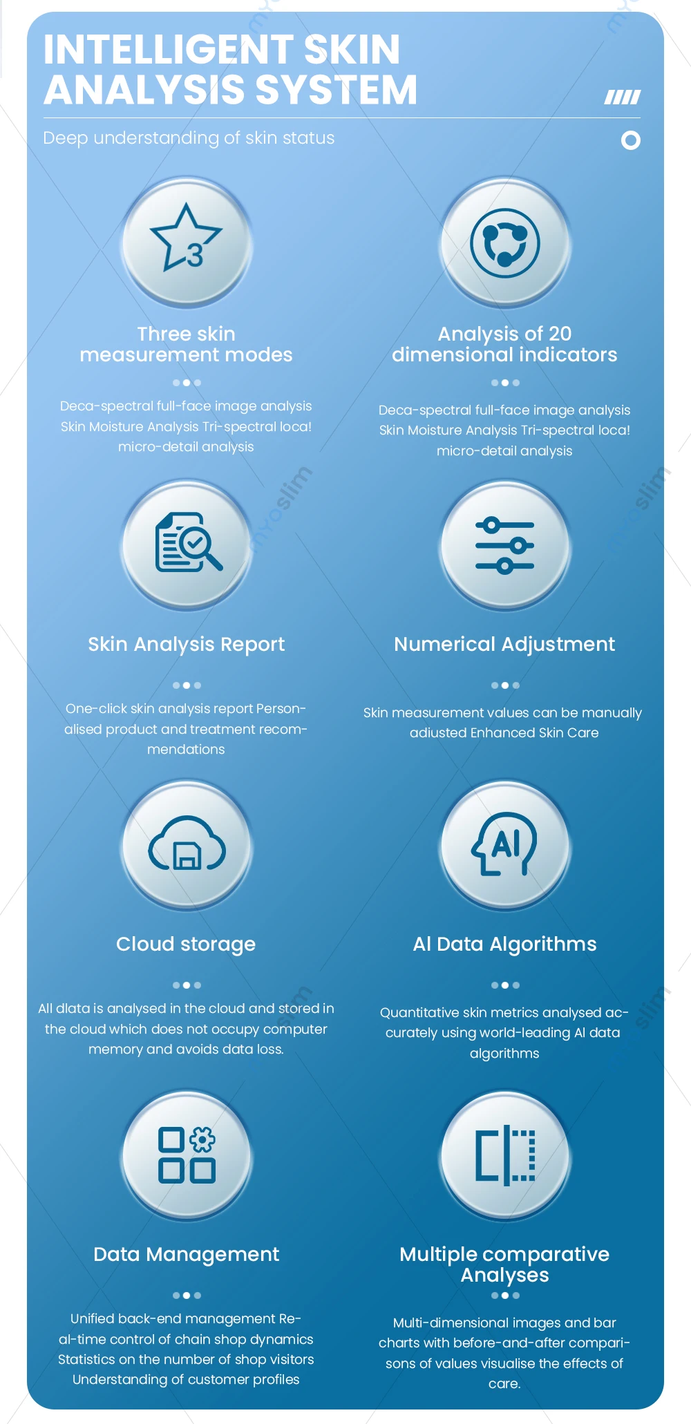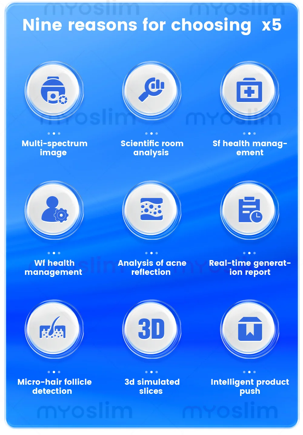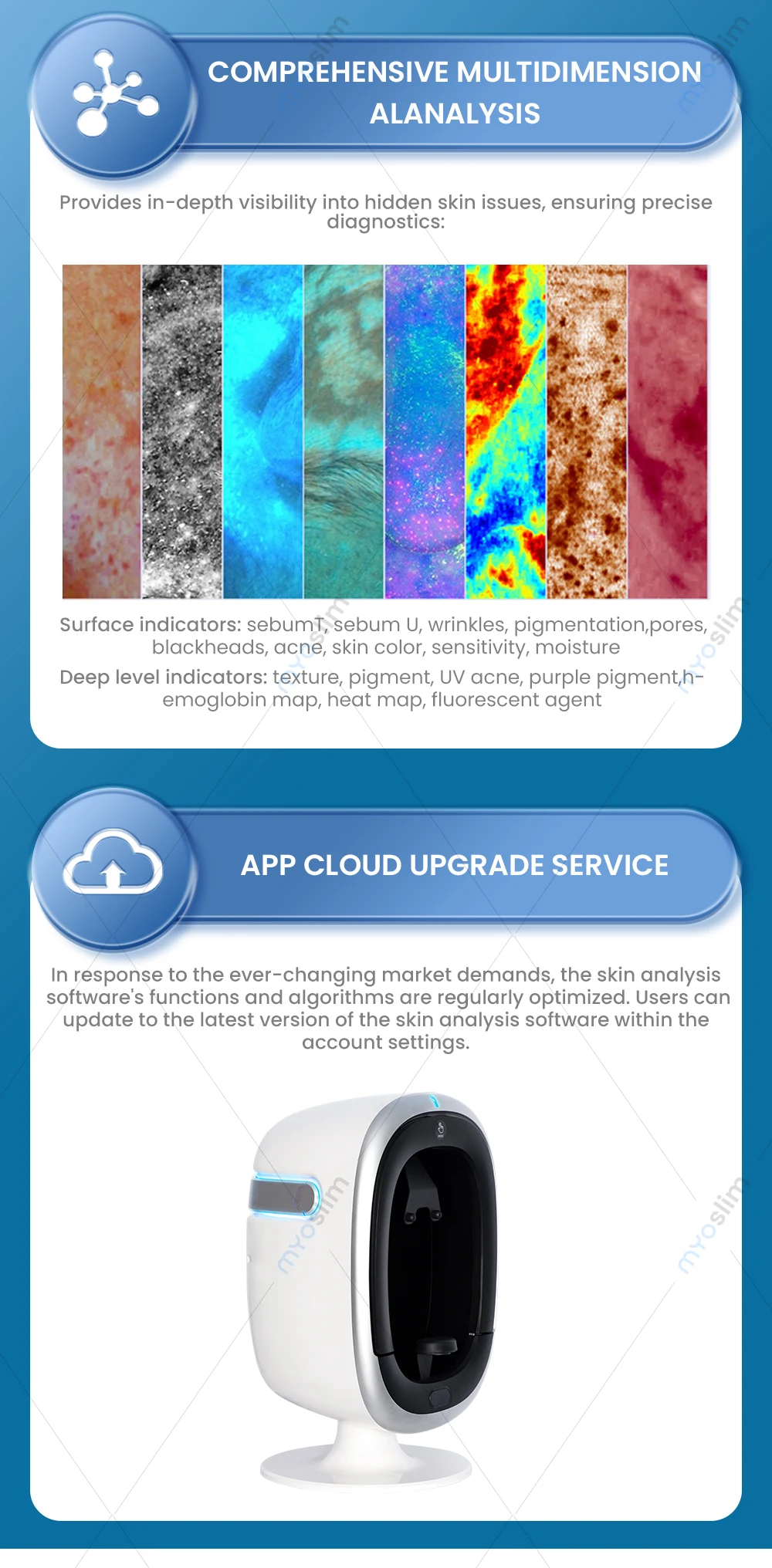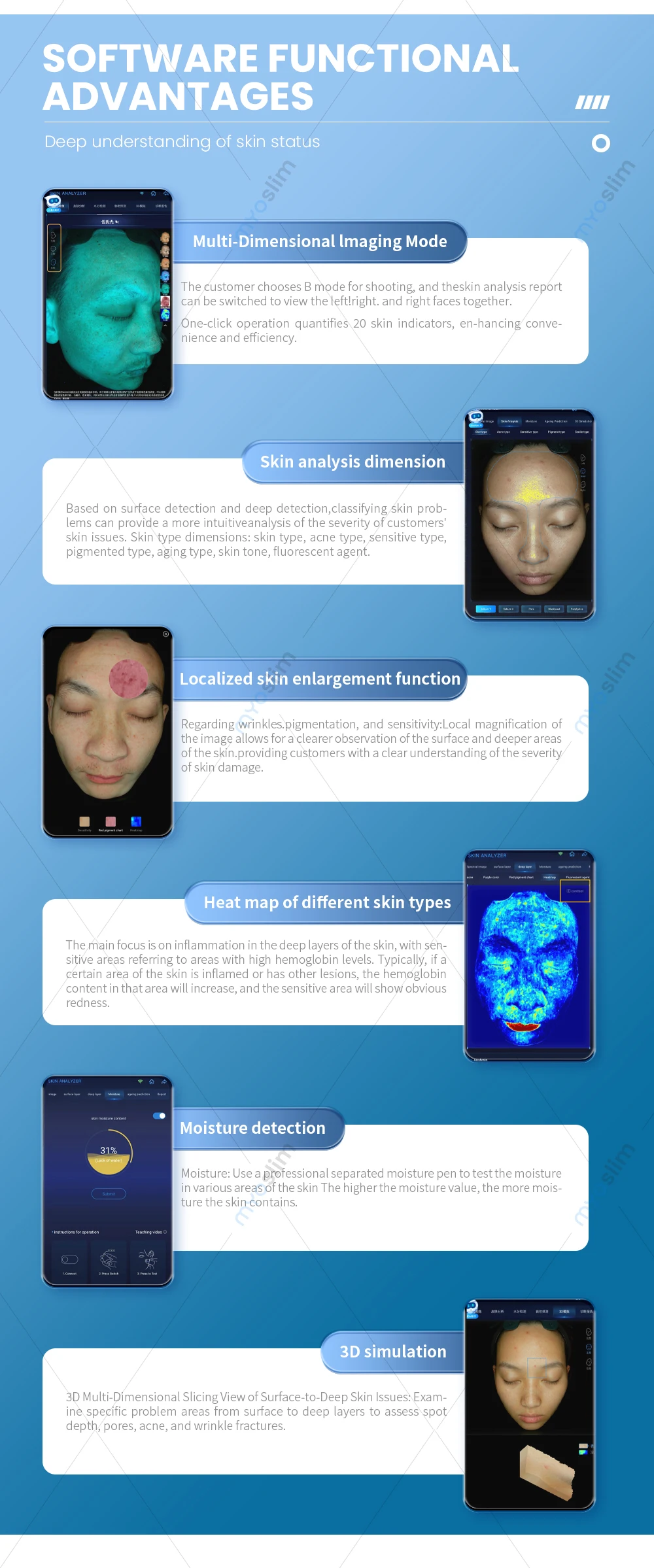 Equipped with a million-level skin database and deep learning algorithm, it can accurately identify dozens of facial skin problems with a detection accuracy of up to 95%.